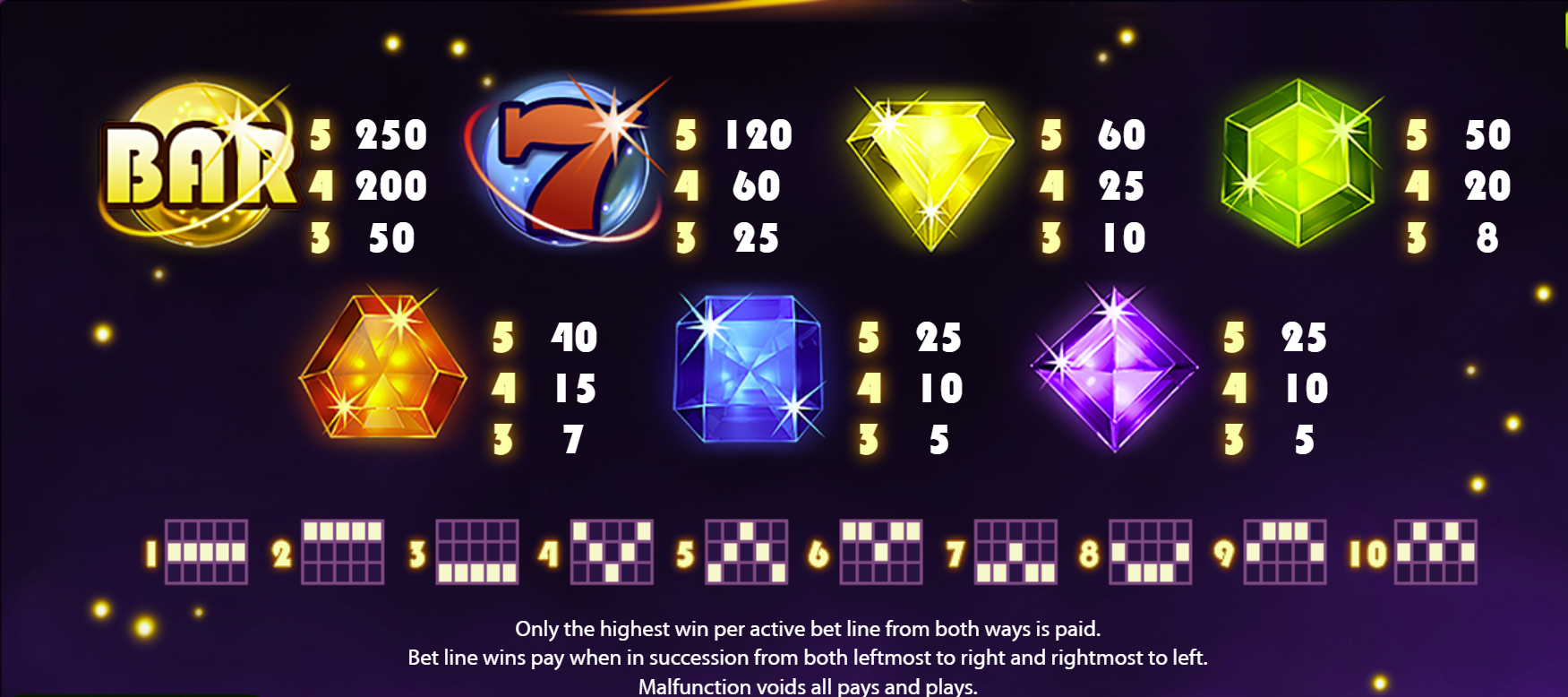 - Gem symbols (various colours) lower-to-mid payouts depending on alignment.